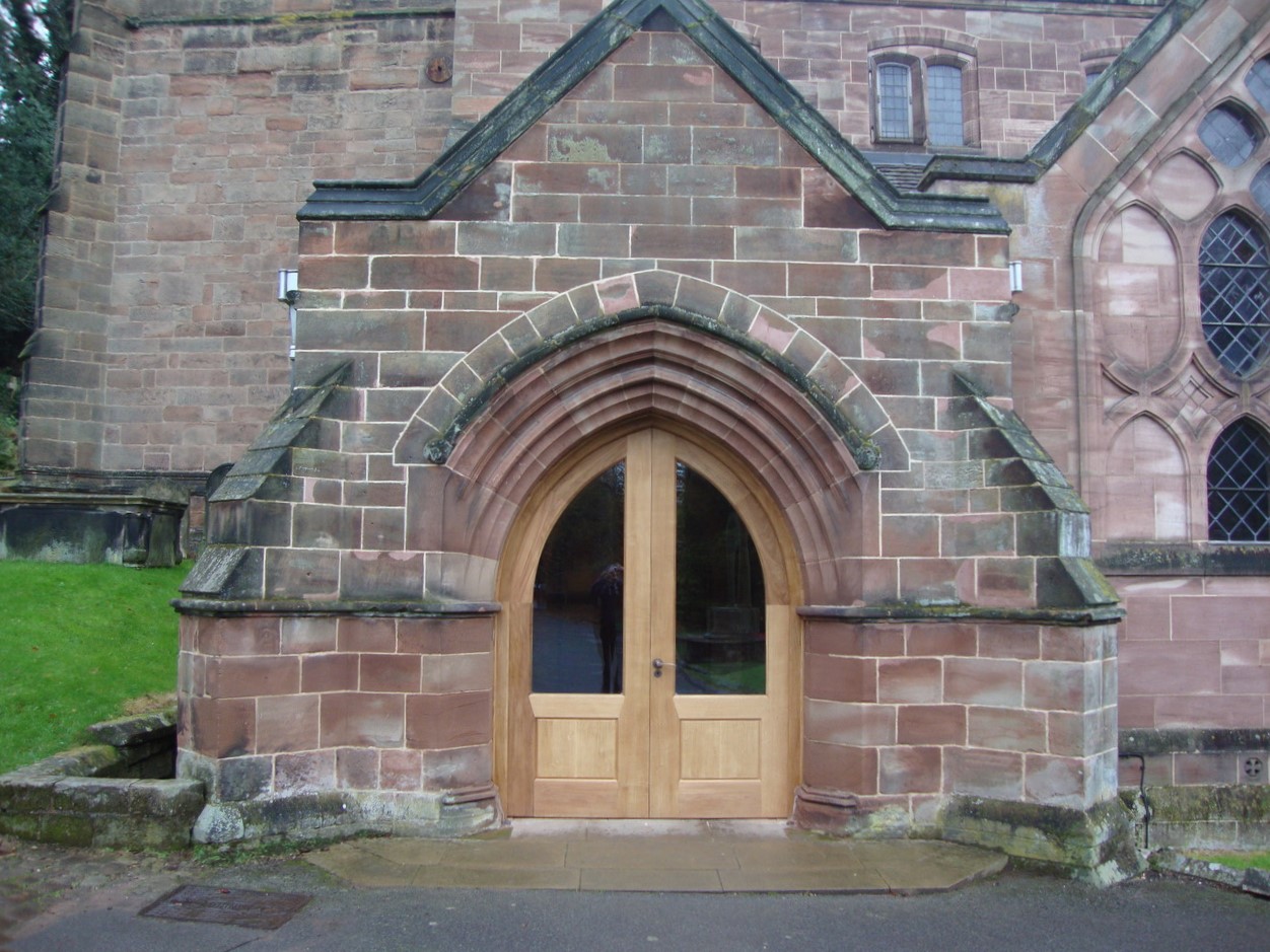 Replacement oak doors in the Inner Vestibule, with glazed panels and a half round fan light above.A freestanding oak collection box, in the centre of the Inner Vestibule floor and curved oak display tables, against the circular Vestibule Walls were made and installed by Vidal and Company of Oswestry. | |